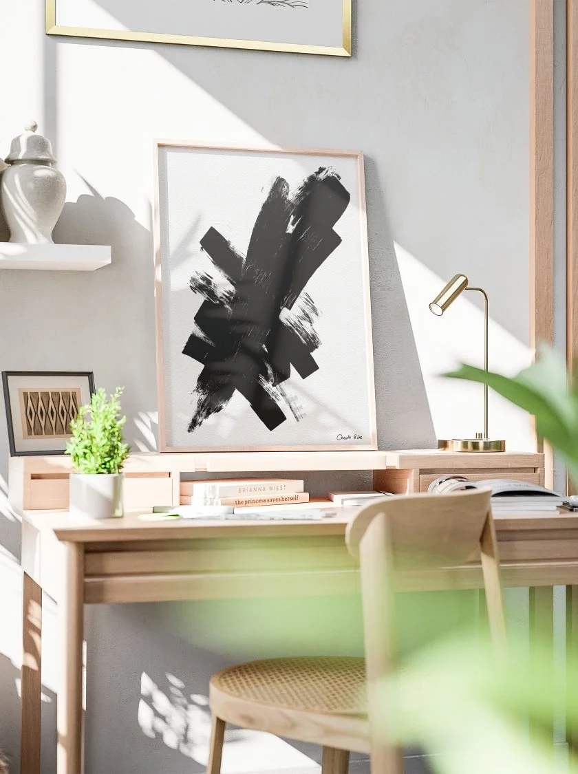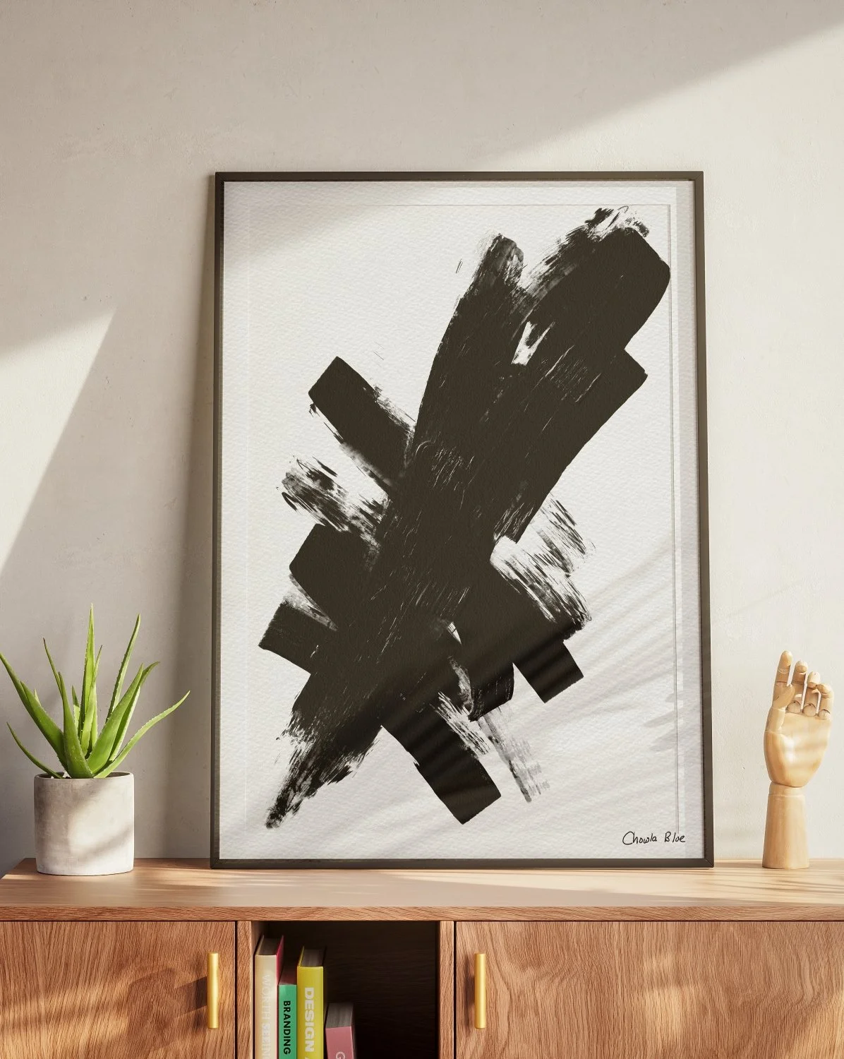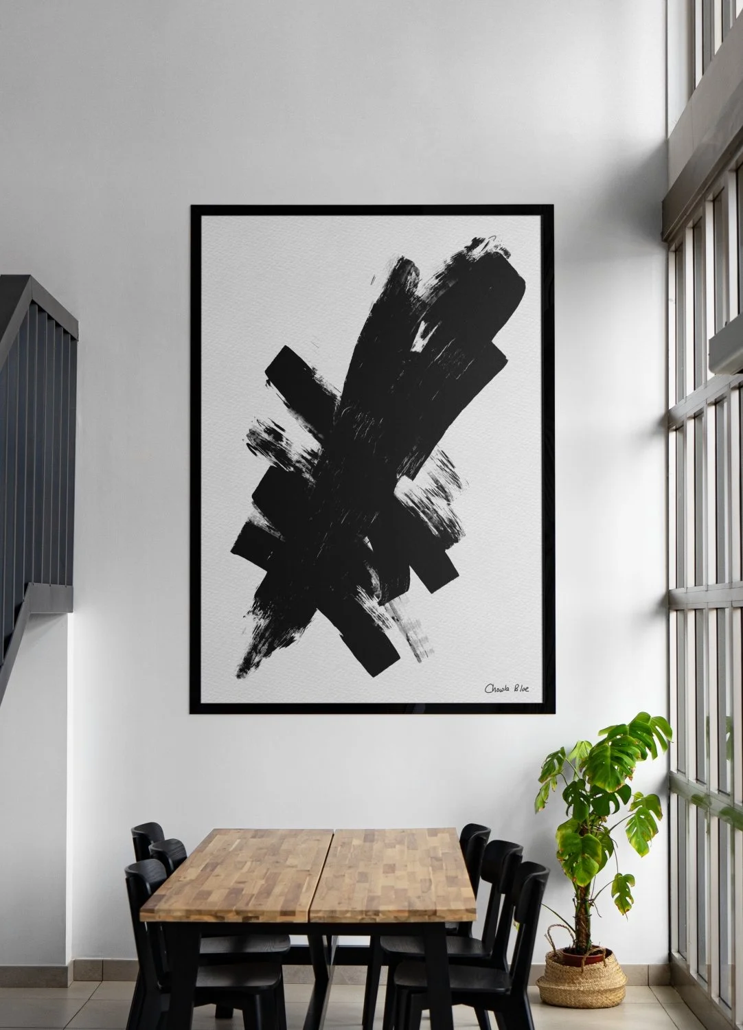 Bold black strokes slash across the canvas in intersecting angles. The result is powerful, dynamic, and commanding—a statement piece that adds energy to any space.