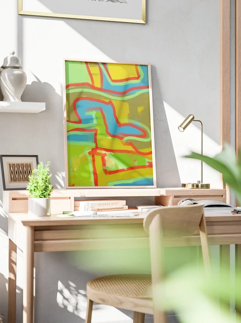 Playful and energetic, this piece bursts with winding lines of crimson, yellow, and electric green. The free-flowing pathways seem alive, like music caught on canvas. A joyful, dynamic artwork that brightens any room with creativity and spark.